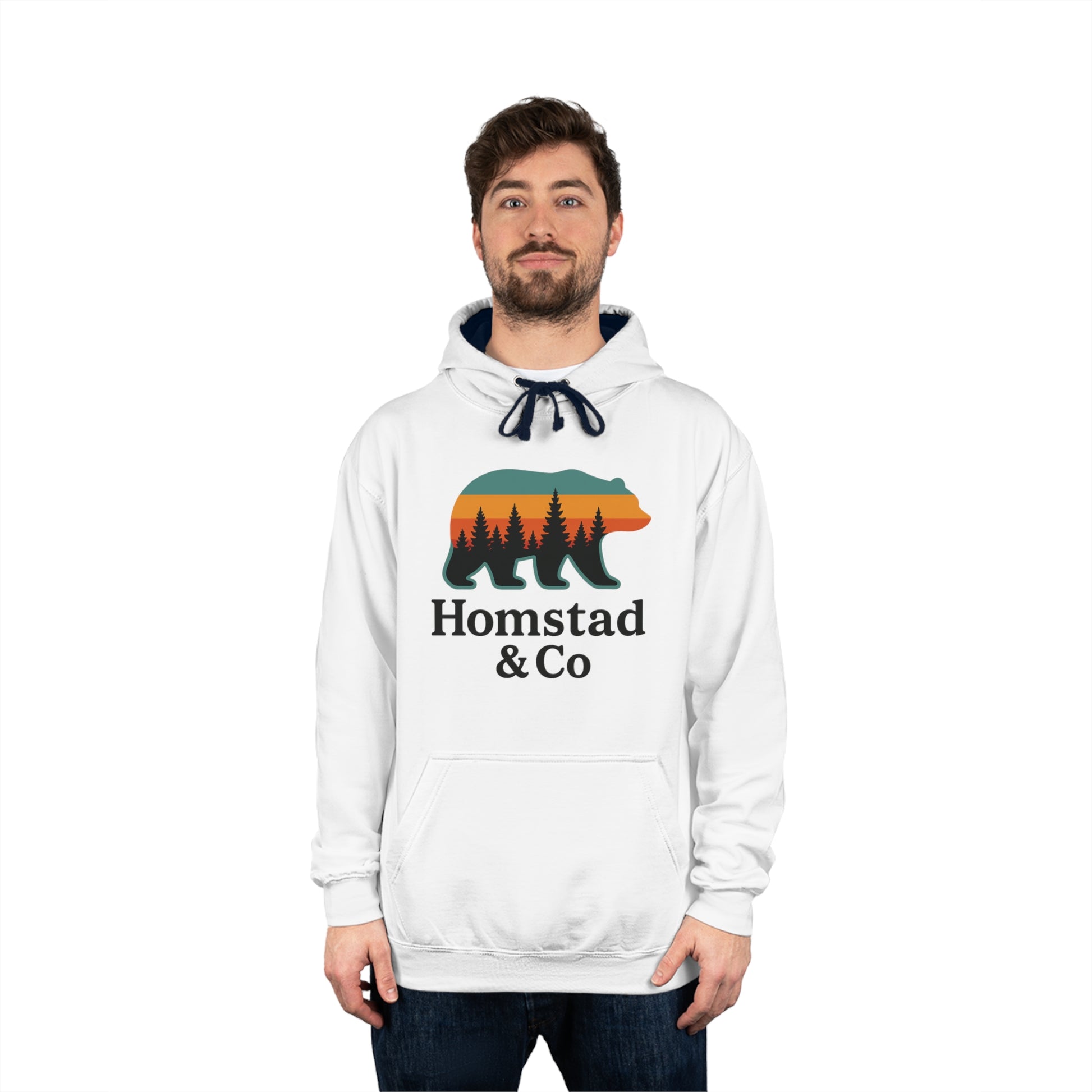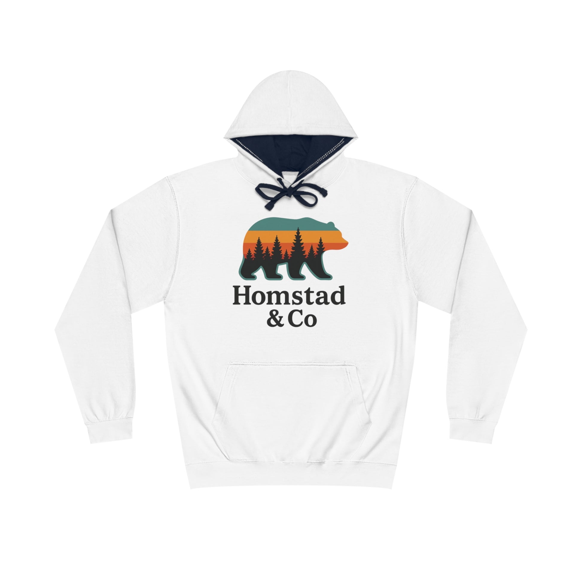A cozy and versatile Unisex Varsity Hoodie featuring the Homstad & Co Bear logo design. Perfect for casual everyday wear or lounging at home. Ideal for those who appreciate comfort and style. Relevant for holidays, casual outings, and cozy nights in.
