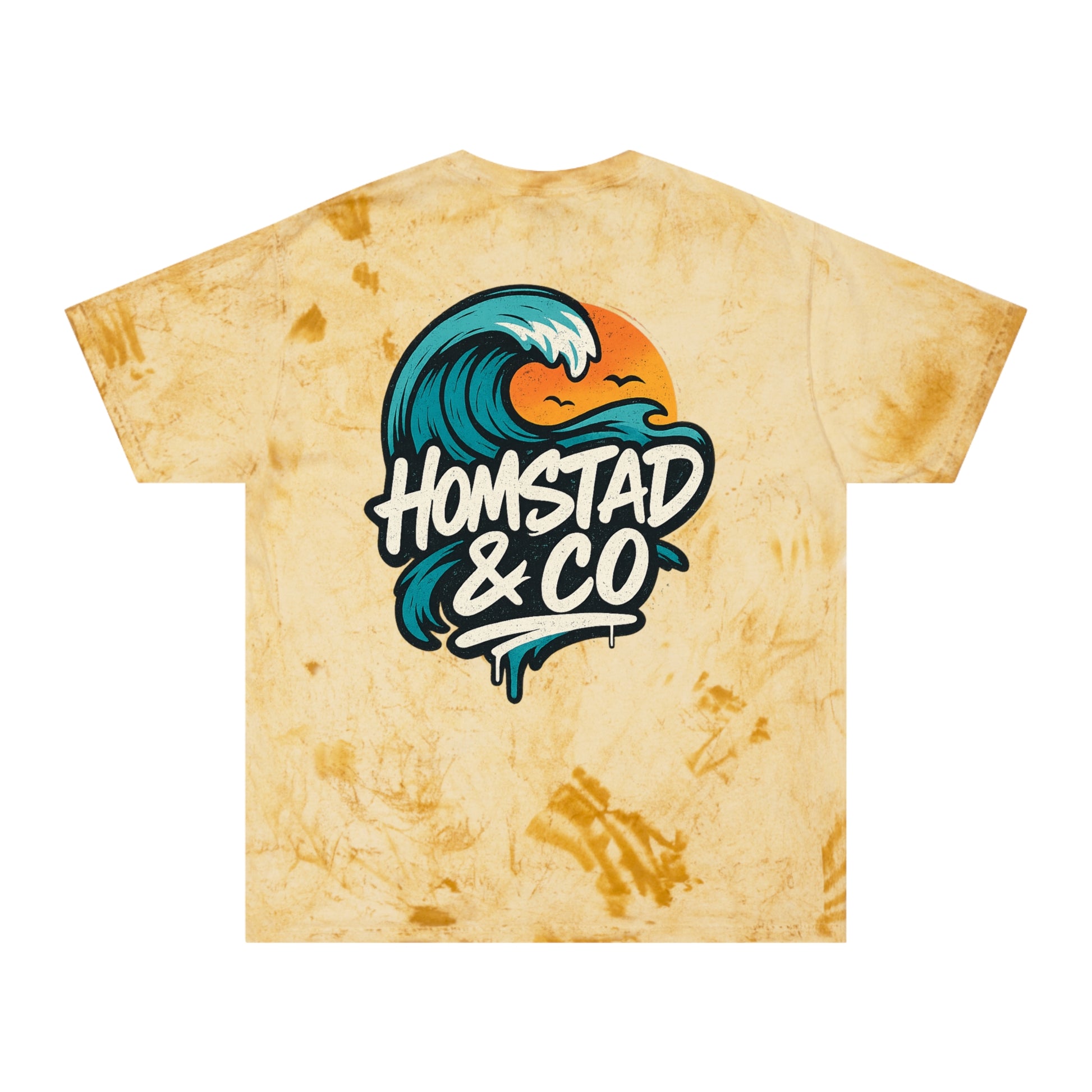 Homstad & Co tie dye T-shirt with a unique Color Blast effect on every garment. Made from 100% ring-spun cotton for a smooth fabric perfect for printing, this relaxed fit tee features double needle stitching for durability and a comfortable twill tape neck seam. The pigment dye technique creates a vibrant and individualized look, making it perfect for casual wear or festivals.
